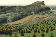 Foran ham er det en tom byggegrop. På skjermen ser han det ferdige bygget