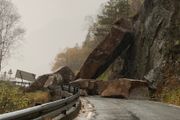Disse steinblokkene deiset ned på rv 13 i Suldal - veien stengt minst et par dager